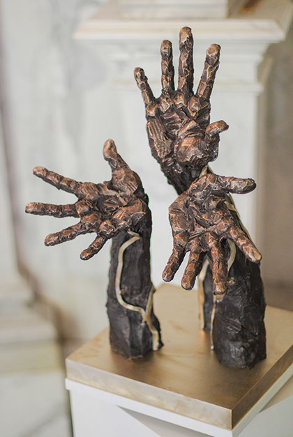 Trois mains tendus, les paumes offertent. Des mains de bronze, comme un soleil ; les doigts brillants, comme des rayons. De larges veines courent le longs de ces bras, comme irrigués de lumière.