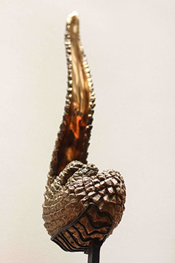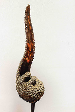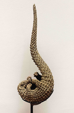 Dans la culture Luba du Congo, le Pangolin incarne une figure mythique, une passerelle entre le monde du jour et celui de la nuit, entre les vivants et les morts. Tout comme la chouette en Occident, il est porteur d’une symbolique profonde, véhiculant la sagesse et la connaissance des mondes invisibles Recroquevillé sur lui-même, sa queue pointé vers le haut l’intérieur laisse découvrir le métal poli, telle une flamme un jeu de lumière s’opère, symbolisant la dualité entre l’ombre et la lumière, entre le monde terrestre et le monde spirituel.