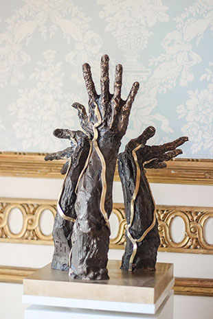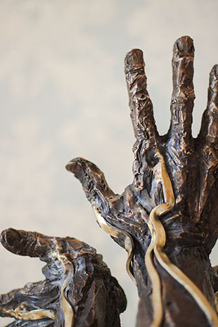 Trois mains tendus, les paumes offertent. Des mains de bronze, comme un soleil ; les doigts brillants, comme des rayons. De larges veines courent le longs de ces bras, comme irrigués de lumière.