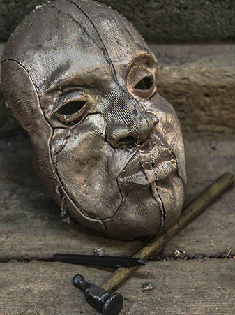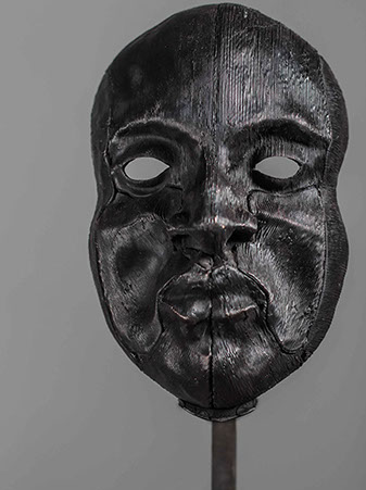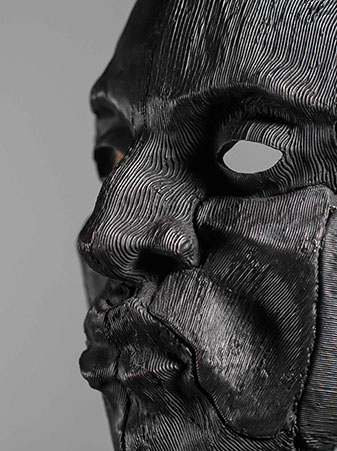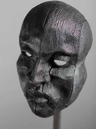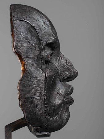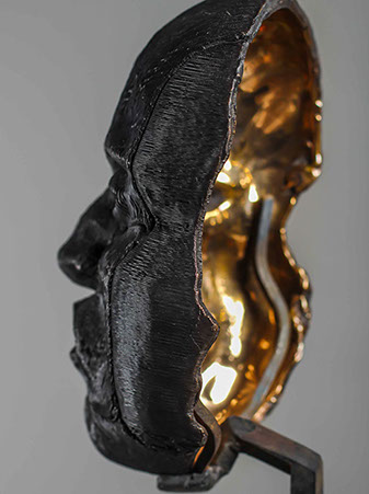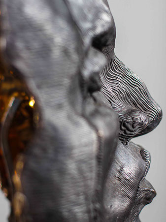 L’impression 3D par dépôt d’un filament de cire donne une scarification en minuscules bourrelets entre tradition et hyper modernité. La cire a ensuite laissé place au bronze.