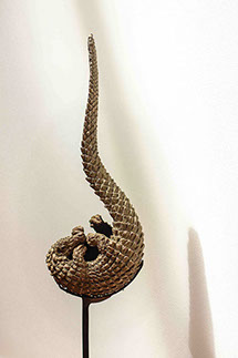 Dans la culture Luba du Congo, le Pangolin incarne une figure mythique, une passerelle entre le monde du jour et celui de la nuit, entre les vivants et les morts. Tout comme la chouette en Occident, il est porteur d’une symbolique profonde, véhiculant la sagesse et la connaissance des mondes invisibles Recroquevillé sur lui-même, sa queue pointé vers le haut l’intérieur laisse découvrir le métal poli, telle une flamme un jeu de lumière s’opère, symbolisant la dualité entre l’ombre et la lumière, entre le monde terrestre et le monde spirituel.