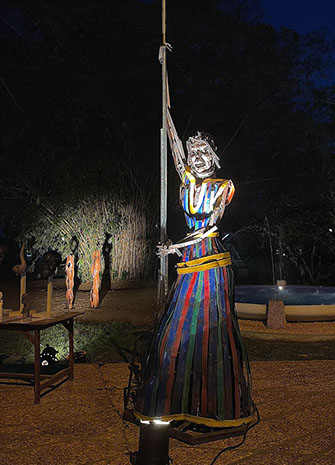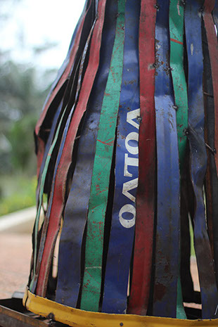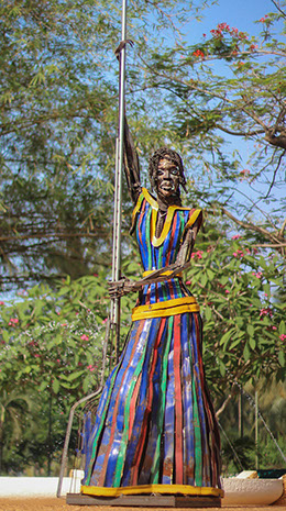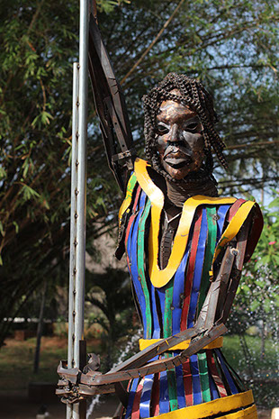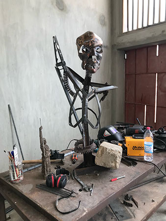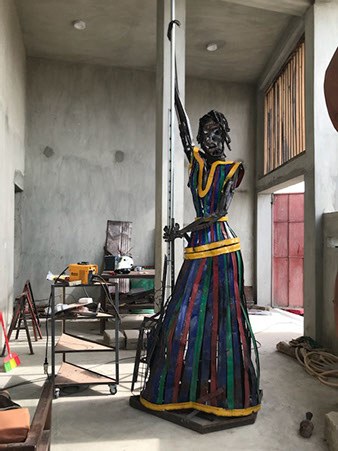 Grande, fière, son arme tendue tel un étendard elle résiste. Faite de cuivre et d’acier elle domine de toute sa hauteur les visiteurs elle nous invite à penser et redécouvrir l’histoire pré coloniale béninoise. Avec cette sculpture je souhaite combiner les techniques de dinanderie orfèvrerie, utiliser pour la réalisation du portrait de Seh-Dong-Hong-Beh et les techniques de création de sculpture à partir de métal et de matériaux recyclé pour la réalisation de son uniforme. Les visiteurs sont invités à venir et revenir dans l’atelier pour voir l’œuvre se construire au file des jours et des découvertes.