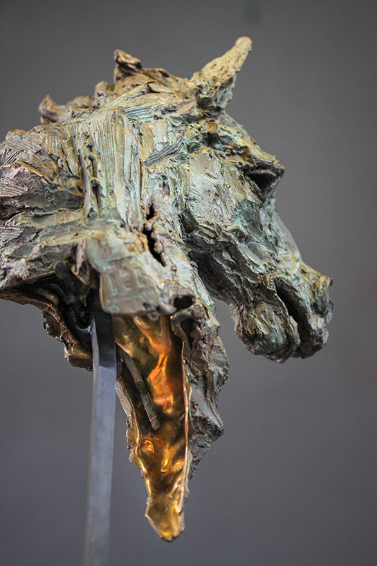 L’intérieur en bronze poli, tel une flamme, symbolise la bravoure et la fougue de l’animal, il rappelle aussi le nom “Rakhsh”, l’éclair en persan.