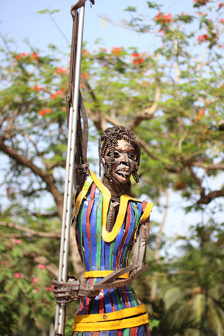 Grande, fière, son arme tendue tel un étendard, elle résiste. Faite de cuivre et d’acier elle domine de toute sa hauteur les visiteurs et nous invite à penser et redécouvrir l’histoire précoloniale béninoise. Avec cette sculpture, j’ai souhaité combiner les techniques de dinanderie orfèvrerie utilisées pour la réalisation du portrait de Seh-Dong-Hong-Beh et les techniques de création de sculptures à partir de métal et de matériaux recyclés pour la réalisation de son uniforme. Les visiteurs sont invités à venir et revenir dans l’atelier pour voir l’œuvre se construire au fil des jours et des découvertes