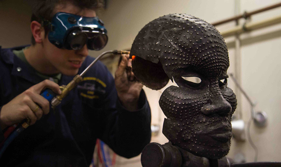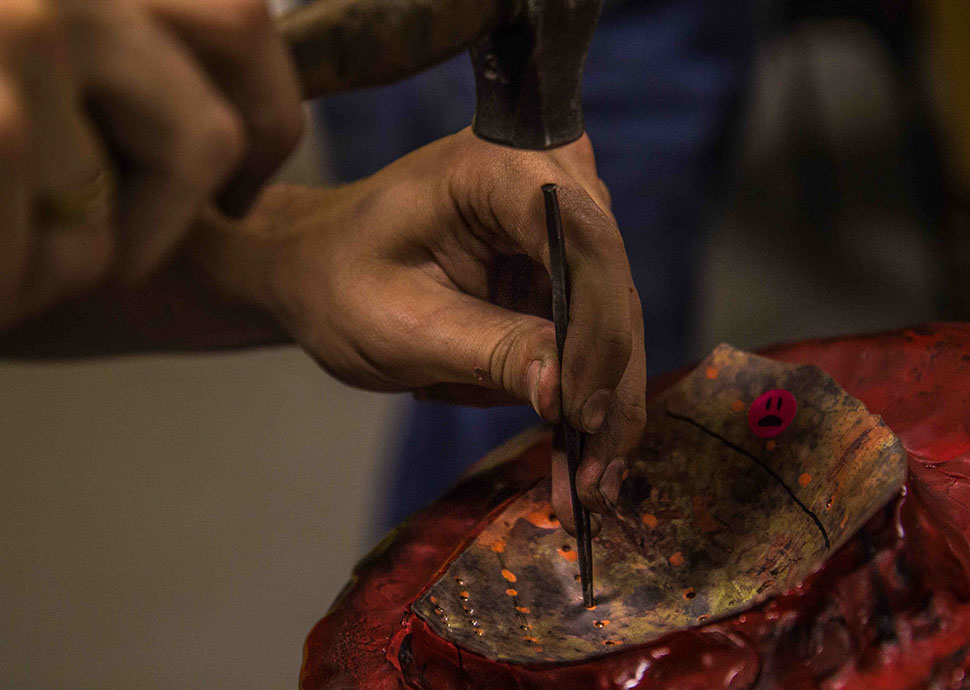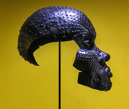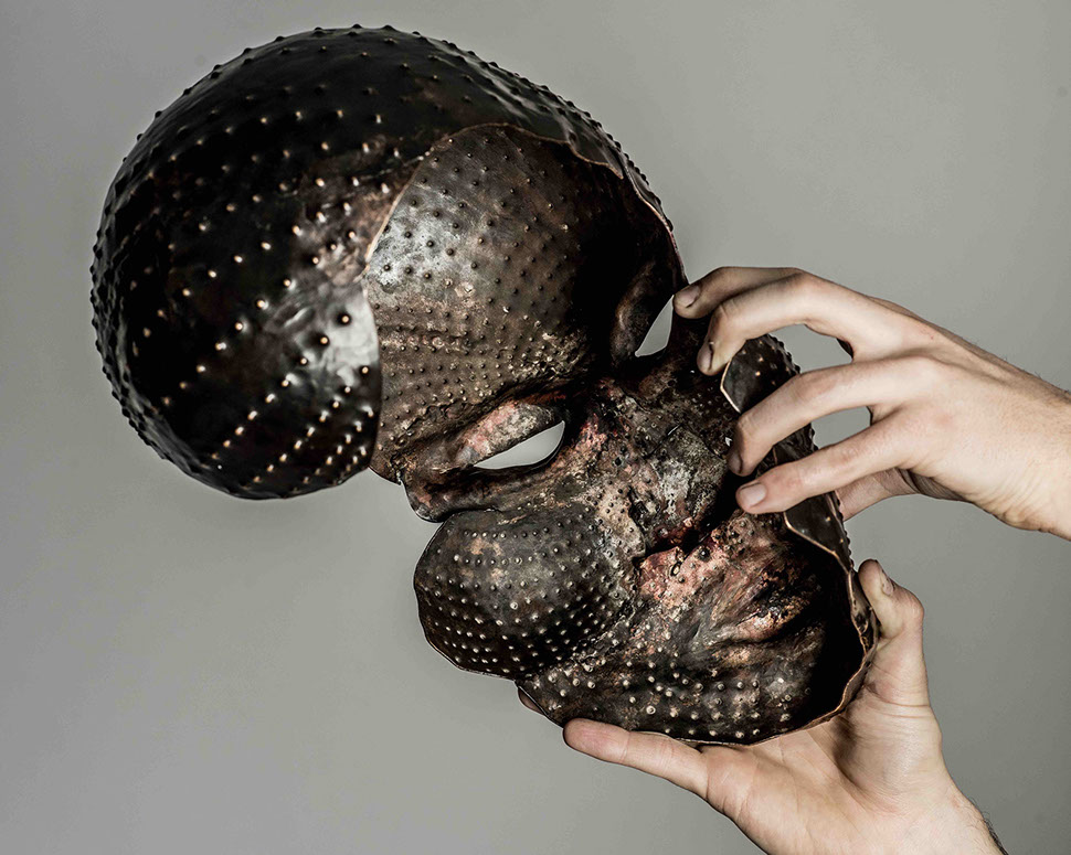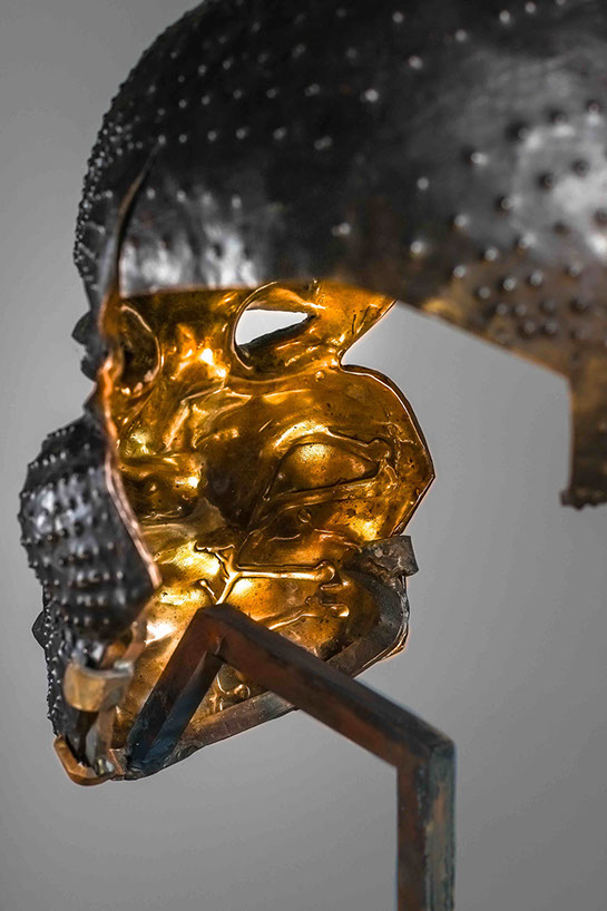 Les Bul Nuers sont une ethnie d’éleveurs aux fortes traditions guerrières vivant dans la région du Soudan du Sud et de l’Éthiopie. Ils utilisent la scarification faciale comme signe de bravoure et de lignage : en effet selon l’orientation des points et leur densité on peut connaître la valeur du guerrier et le nombre d’ennemis, hommes ou fauves, qu’il a vaincus. Les Nuer opèrent une scarification en demi-cercle, ce qui permet à la peau de cicatriser vers l’extérieur et ainsi créer des dessins par points. Pour ce masque j’ai utilisé un ciselet à bout rond pour emboutir le métal et venir imiter cette rétractation que subit la peau des Bul Nuers.