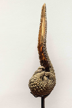 Dans la culture Luba du Congo, le Pangolin incarne une figure mythique, une passerelle entre le monde du jour et celui de la nuit, entre les vivants et les morts. Tout comme la chouette en Occident, il est porteur d’une symbolique profonde, véhiculant la sagesse et la connaissance des mondes invisibles Recroquevillé sur lui-même, sa queue pointé vers le haut l’intérieur laisse découvrir le métal poli, telle une flamme un jeu de lumière s’opère, symbolisant la dualité entre l’ombre et la lumière, entre le monde terrestre et le monde spirituel.