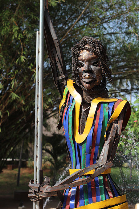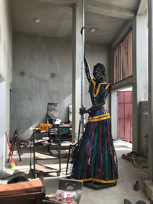 Grande, fière, son arme tendue tel un étendard, elle résiste. Faite de cuivre et d’acier elle domine de toute sa hauteur les visiteurs et nous invite à penser et redécouvrir l’histoire précoloniale béninoise. Avec cette sculpture, j’ai souhaité combiner les techniques de dinanderie orfèvrerie utilisées pour la réalisation du portrait de Seh-Dong-Hong-Beh et les techniques de création de sculptures à partir de métal et de matériaux recyclés pour la réalisation de son uniforme. Les visiteurs sont invités à venir et revenir dans l’atelier pour voir l’œuvre se construire au fil des jours et des découvertes